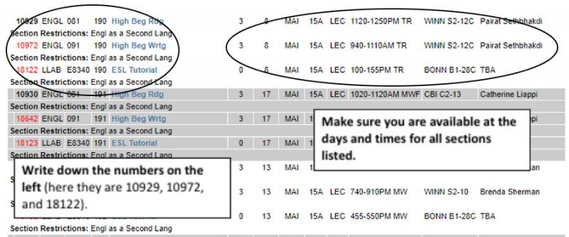 4. Scroll down to find the course(s) you need. Linked sections are shown together and are the same color (either white or gray). You must register for all of the courses listed together. Look at the times and days listed to find classes that work for you. Write down the 5-digit numbers on the left for all sections you need.