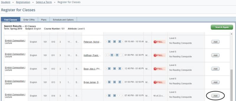 20. Scroll through your search results until you locate a section that you would like to register for. Click the “Add” button next to the class.