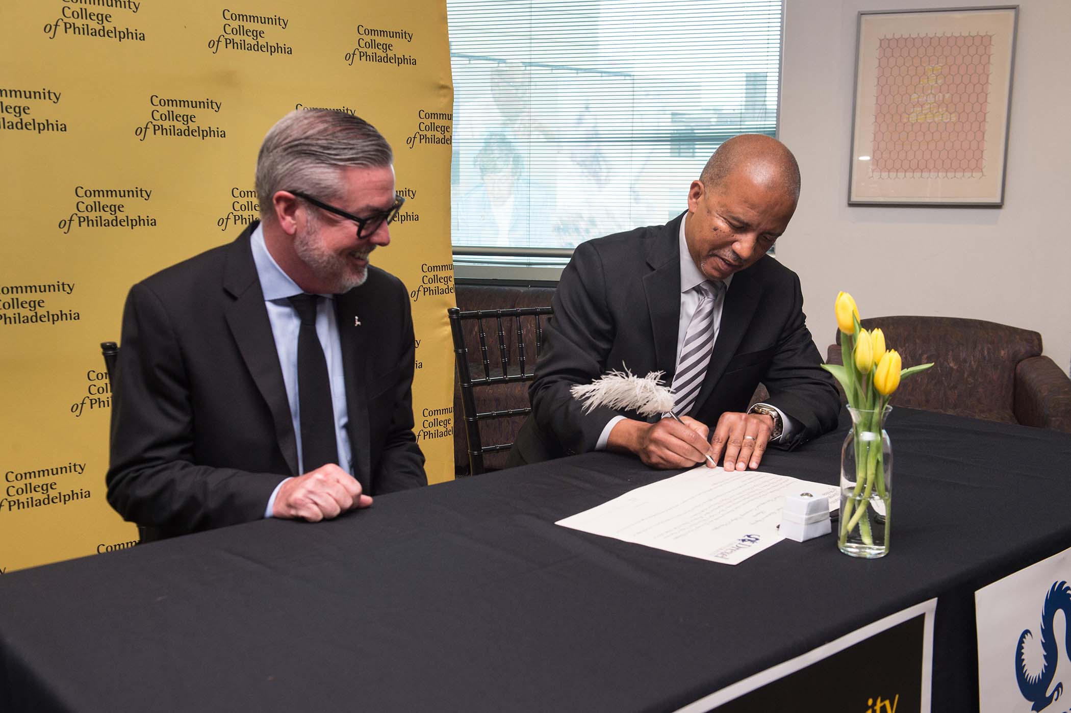 The Pathways Magazine breakfast event celebrated the publication of the Spring 2017 edition of the College's own Pathways Magazine, which featured Drexel University President John Fry, as well as Dual Admissions student success stories. After breakfast, President Fry joined President Dr. Generals in signing a dual admissions agreement between the Community College of Philadelphia and Drexel University.