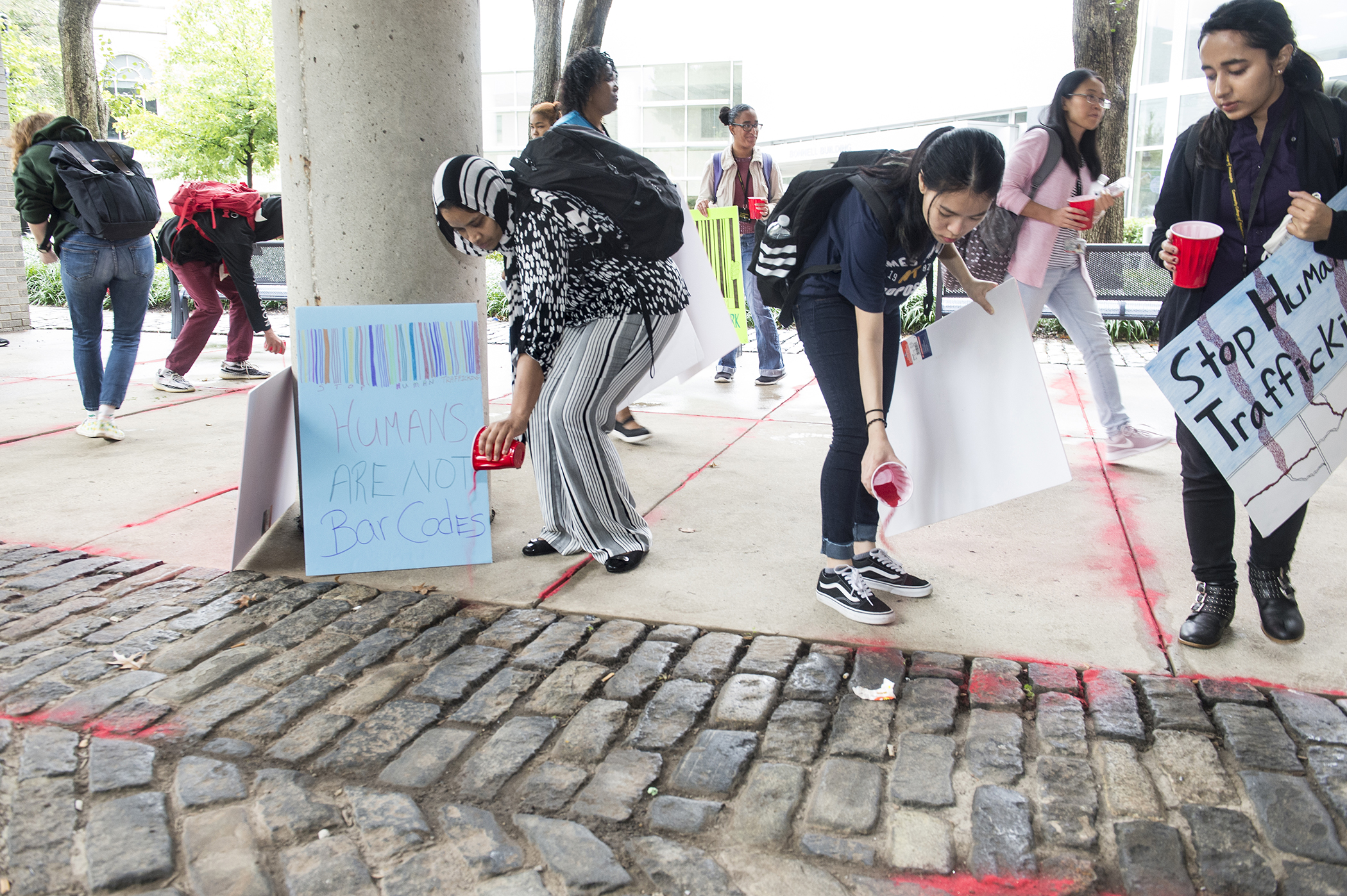 The College marked its third annual Human Trafficking Awareness Day with a series of events on Thursday, Oct. 11. The day began with stories from a trafficking survivor. Other sessions included fair trade and its impact on human trafficking, how law enforcement and the courts are working together to combat human trafficking, and screenings of the documentary, "Not My Life," a film that  depicts the cruel and dehumanizing practices of human trafficking and modern slavery on a global scale. Faculty, staff and students gathered outside the Bonnell Building at 11:30 a.m. for the Campus Walk for Awareness: Red Sand Walk (#RedSandProject). Molly Gochman, artist and activist, started the Red Sand Project with the intent of raising awareness of human trafficking and exploitation. By utilizing red sand as a medium, participants are reminded of those suffering this form of modern day slavery.